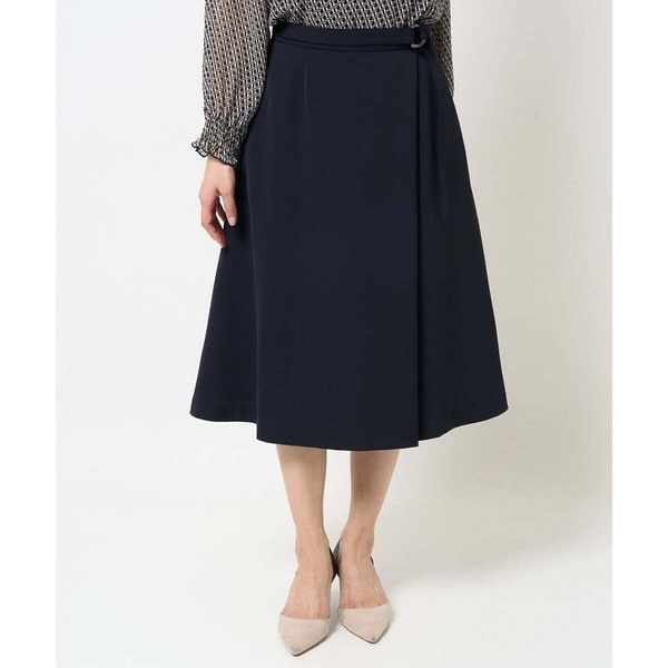 Aラインシルエットがきれいなスカート。大きめのタックデザインでラップ風を表現し、共地ベルト付き。Aラインのシルエットなので足さばきも良く、ラップ風なので、足元がはだける心配もありません。ウエスト後ろはゴム仕様で、快適な着心地。ベルトのDカンがキラリと光るアクセントに。