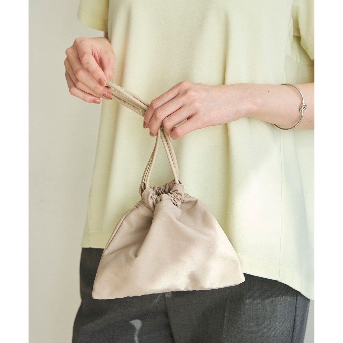 ■デザイン見た目もサイズ感も可愛く、コーディネートを選ばず使えるバッグです。間口も広く、見た目よりも収納力があり、巾着紐によって中身が落ちないので安心して使用できます。内側には、カードケースや携帯などの小物を入れられるポケット付き。