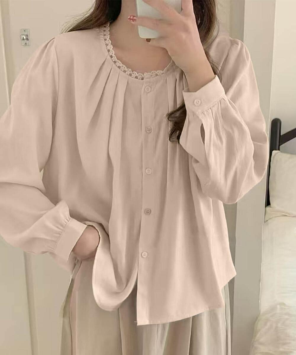優雅で柔らかいデザインが特徴。首元と袖口にレース装飾を施しており、フェミニンな印象を与えます。シンプルでありながらも華やかさがあり、デイリーユースにぴったりです。
