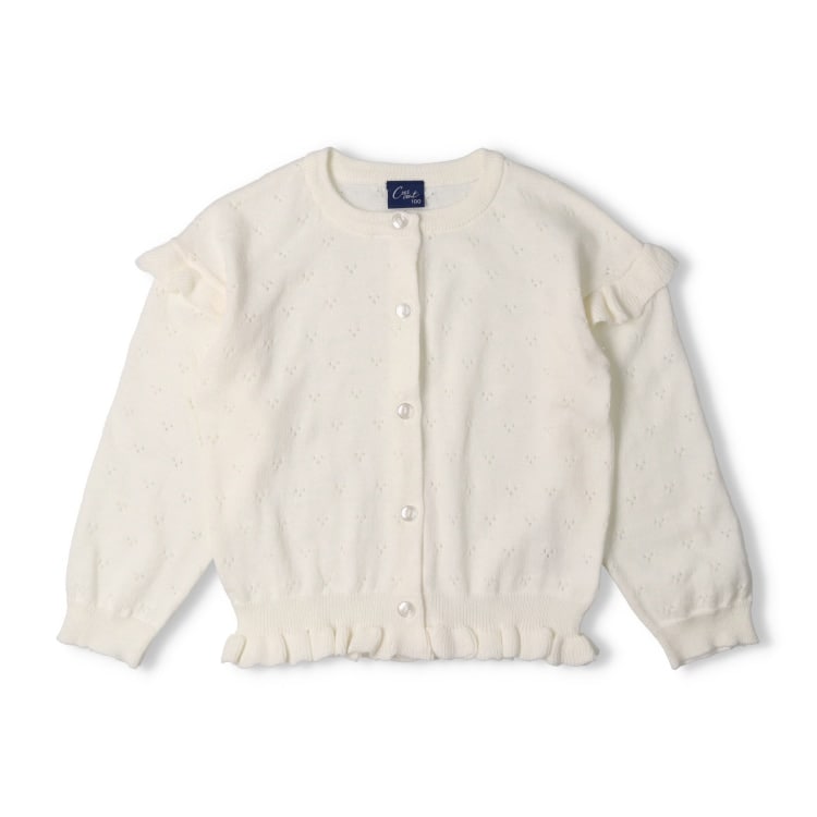 肩のフリルも女の子らしいシンプル無地デザインのカーディガン。透かし編みニット素材でカジュアルにもオケージョン、プチフォーマルなどのハレの日にも使えます。お家でお洗濯できるのもポイント!【アイテム】トップス シンプル ガーリー フェミニン カジュアル お洒落 オシャレ かわいい 可愛い 普段着 デイリーウェア お出かけ着 お外着 お外遊び着 子ども こども 女児 女の子 ガールズ キッズ ベビーサイズ トドラーサイズ 幼稚園 保育園 小学校 通園 通学 小学生 2025年春夏物新作 丸高衣料 ロングスリーブ 長袖 オケージョン プチフォーマル 卒園式 入園式 入学式 七五三 結婚式 オフホワイト 白色 ネイビー 紺色 クレセント コハレの日