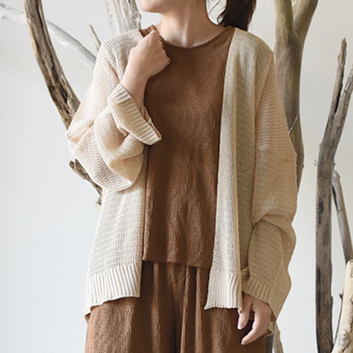 暑い季節も快適に過ごせる!サマーニットカーディガン。クセのないベーシックなデザインなので、どんなコーデにも合わせられる優秀な1枚。ボタンが付いていないのでさらりと気軽に羽織れます。袖は長めで手の甲までしっかり隠れるので、冷房対策・UV対策としても◎薄手でコンパクトに畳めるので持ち運びにも便利です!