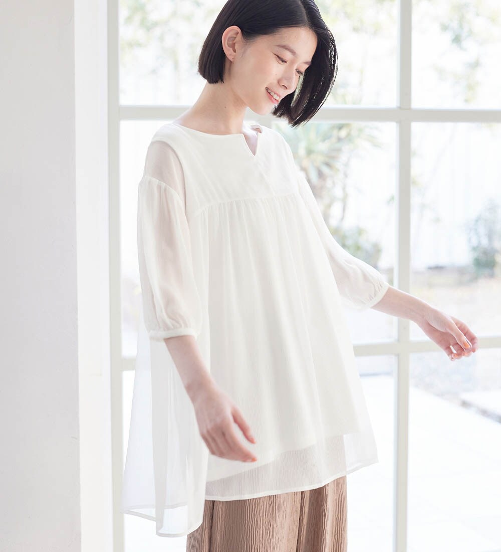 表地は、透け感のあるシフォン素材のブラウス。インナー部分は、吸水速乾・UV対策・抗菌防臭・保湿加工の機能がついた綿混カットソーで、ブラウスでも肌に優しく快適な着心地に。ふわっとしたシルエットでおしゃれに体型カバーも叶う!