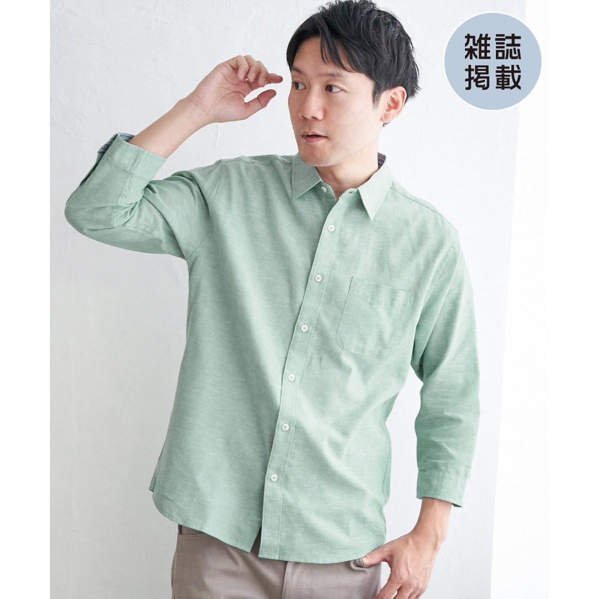 速乾性とイージーケア加工(ネイビーを除く)が施された7分袖レギュラーカラーのリネンシャツ。
