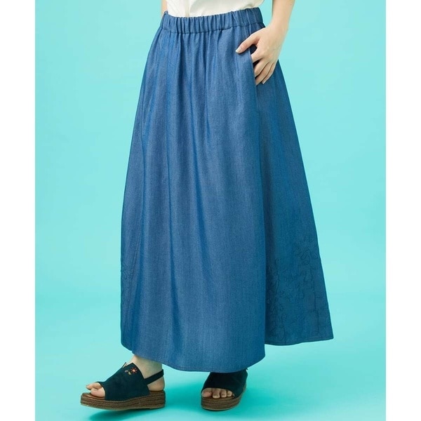 セルロースを使用したデニム生地のスカート。とろみのある素材も相まって美しいフレアなAラインシルエットです。生地の柔らかさとウエストのオールゴムで楽な穿き心地を実現。切り替えを縦に入れてメリハリを出したデザインで、両サイドの切り替えたパーツの裾部分にコード刺繍でお花のモチーフを施しました。微配色のコード刺繍が上品でデザインポイントです。便利なポケット付き。