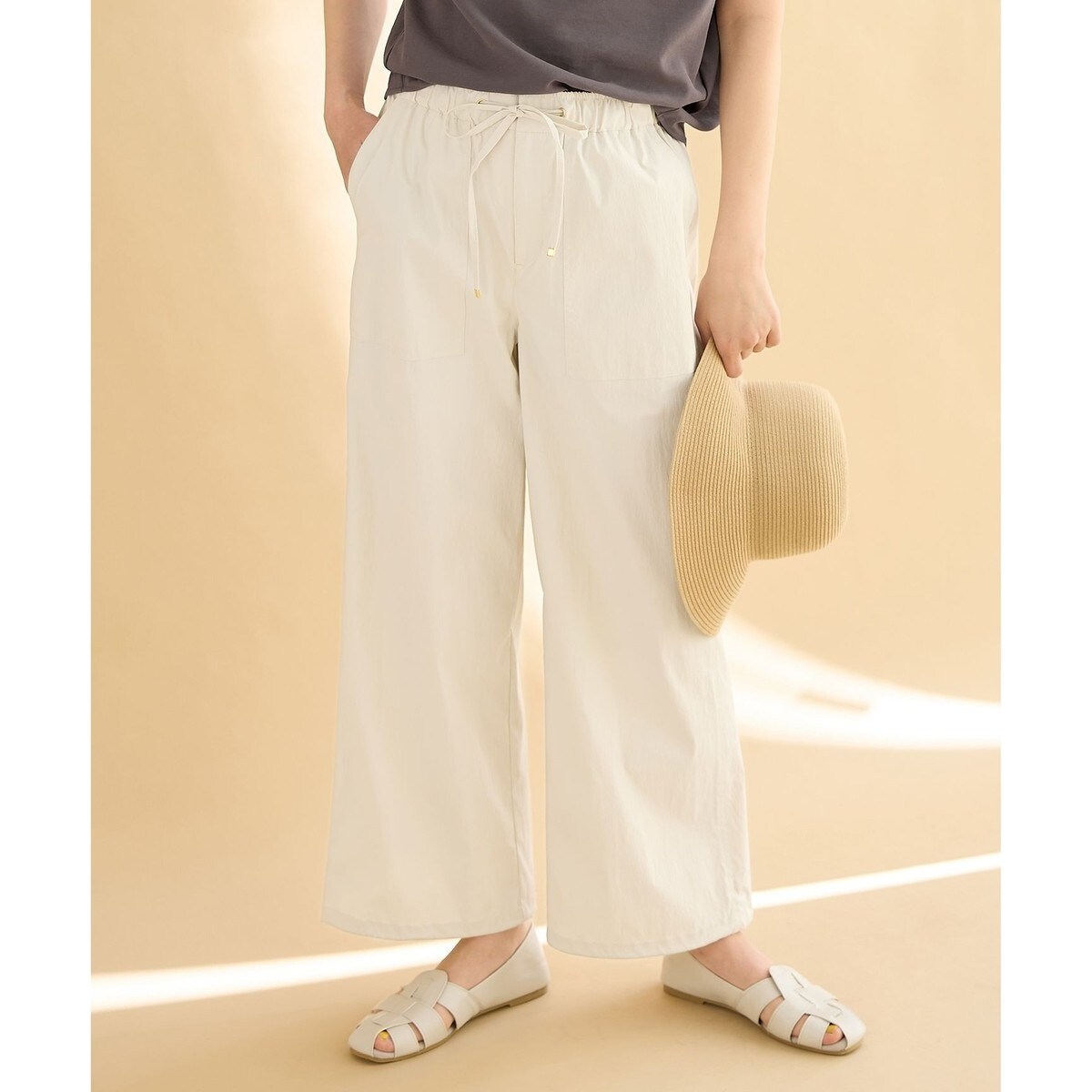 ・フロント部分のベイカーポケットが、シンプルなトップスと合わせても一味違うスタイリングに・裾をドロスト紐を入れることにより、裾を絞ってシルエットの変化を楽しめる・ウエストはゴム仕様なので履き心地楽々