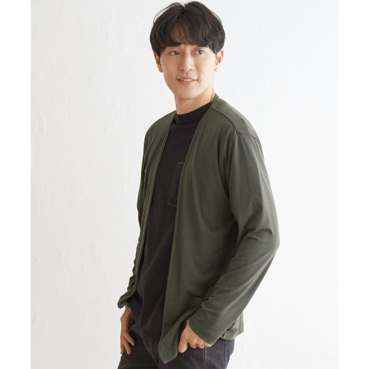 7分袖バイカラーボタンレスカーディガン
