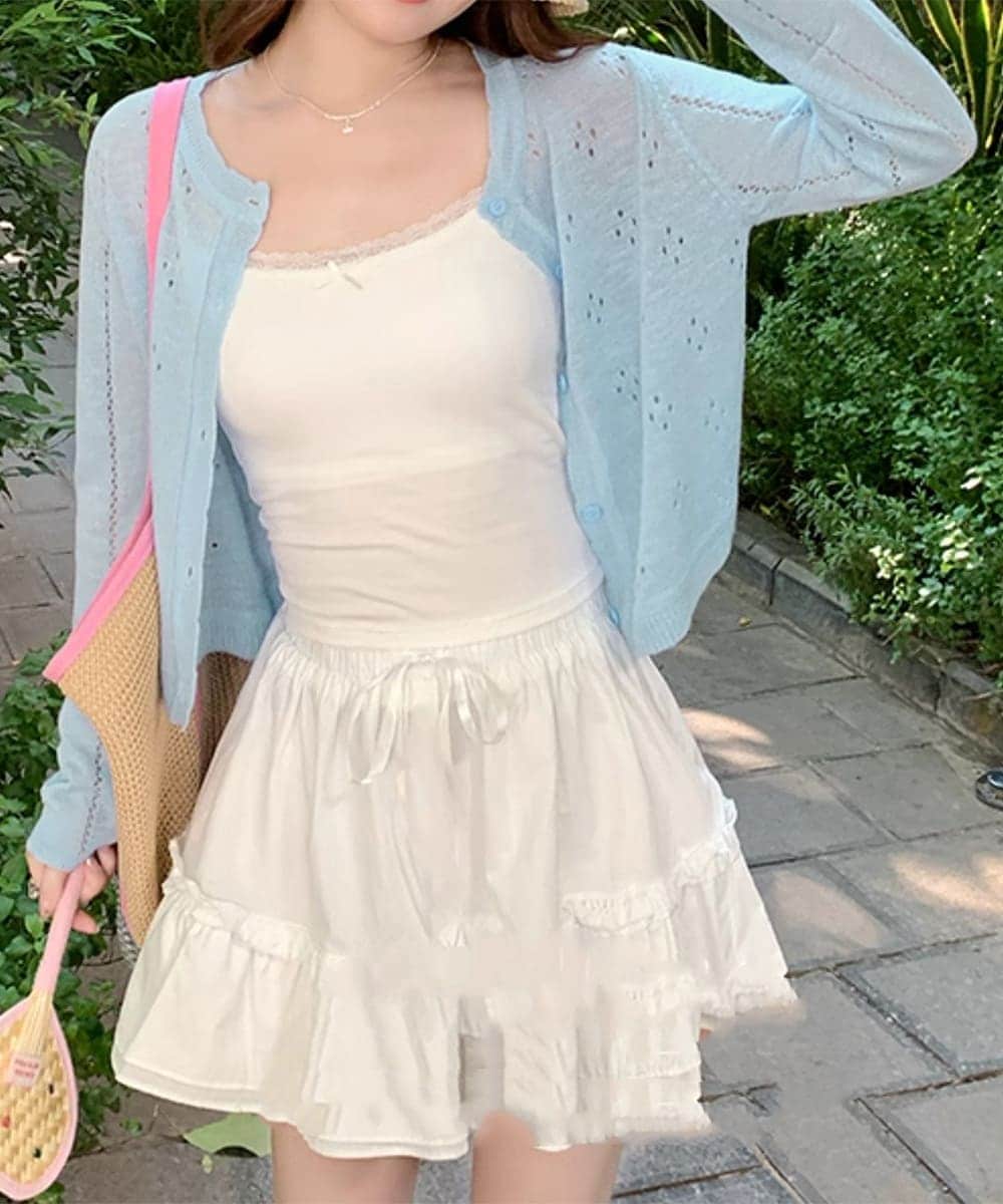 インナーにキャミソールやタンクトップを合わせれば、フェミニンなスタイリングが完成。
