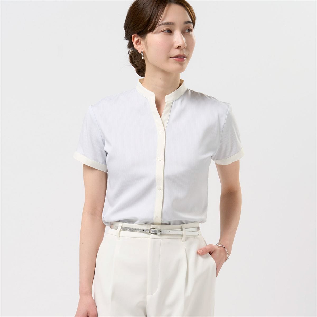 ポリエステル素材  /  ストライプ  /  半袖  /  LL・13号以上あり  /  S・7号以下あり  /  UVカット加工  /  ストレッチ  /  スタンドカラー