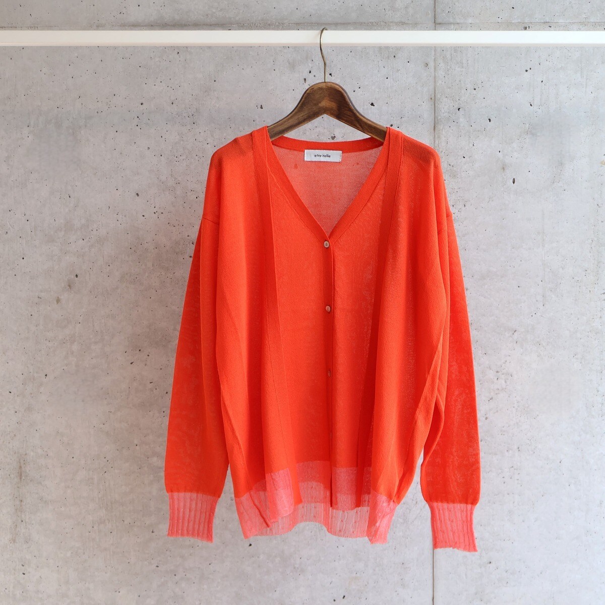 軽やかで涼しげな印象を与え、落ち感とサラッとした肌触りのニットです。リブ部分はシアー素材になっていて、交差編みを入れたリブが可愛い仕様となっています。
