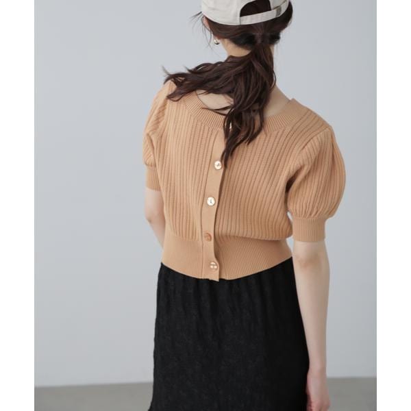 程よくざっくりとした編地でどんなボトムスにも合わせやすい半袖ニット。身頃と袖はふんわりとしたシルエットで、裾と袖口は編地変化でメリハリを叶えてくれます。すっきりとした丈感で、インでもアウトでも着こなせる便利なデザイン。前後2wayでカーディガンとしてもプルオーバーとしても着用できます。コンパクトなサイズ感なのでパンツもでスカートでも相性が良く、キャミワンピースの羽織りにもおすすめです。※モデルの着用画像の場合、光の当たり具合により、実際の色味と異なって見えることがございます。色味は、商品単体の画像をご参照ください。