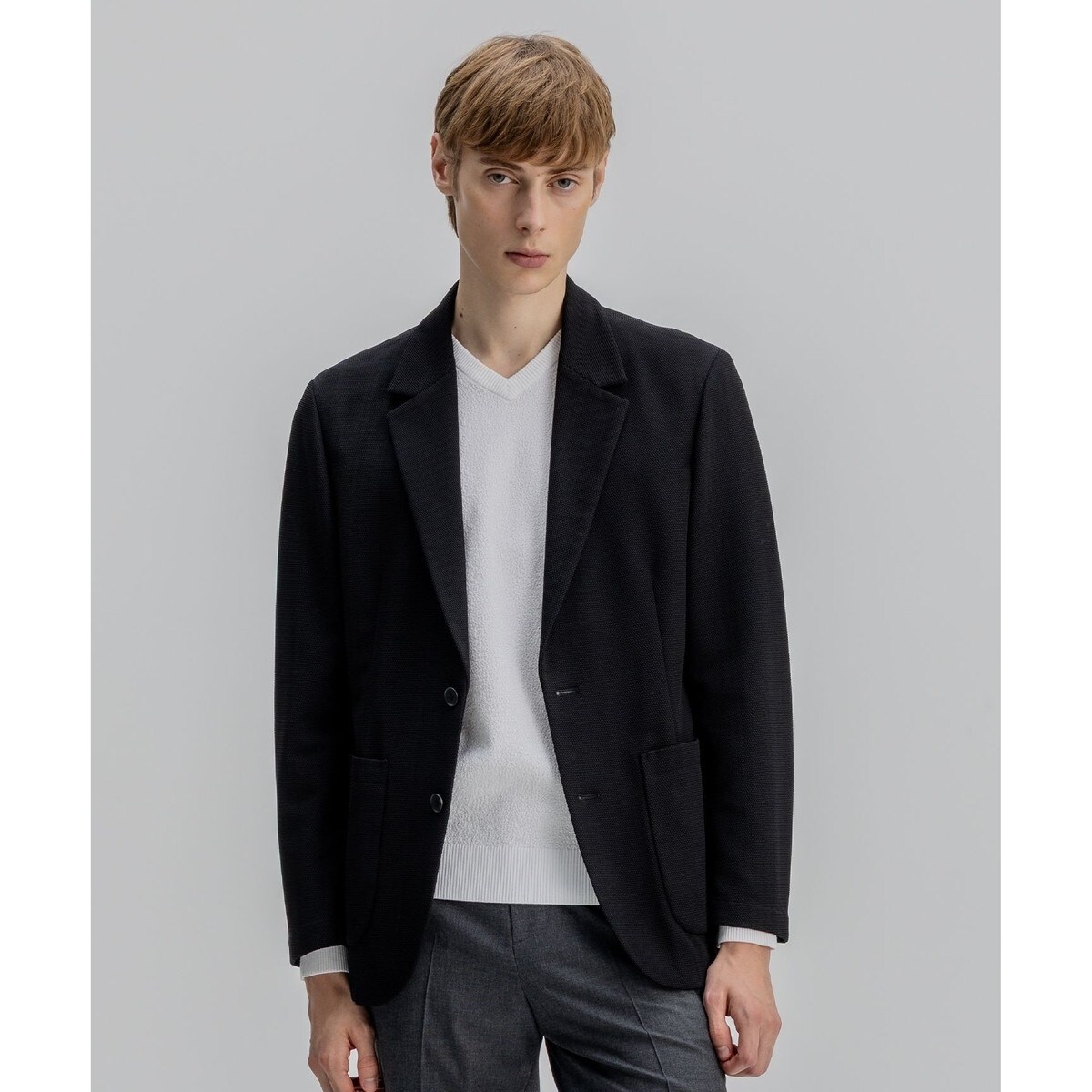 プレーンな2Bジャケット。少しゆとりのあるシルエットで腰のパッチポケット、ノーベントとトレンドのリラックスデザイン。裏無し。
