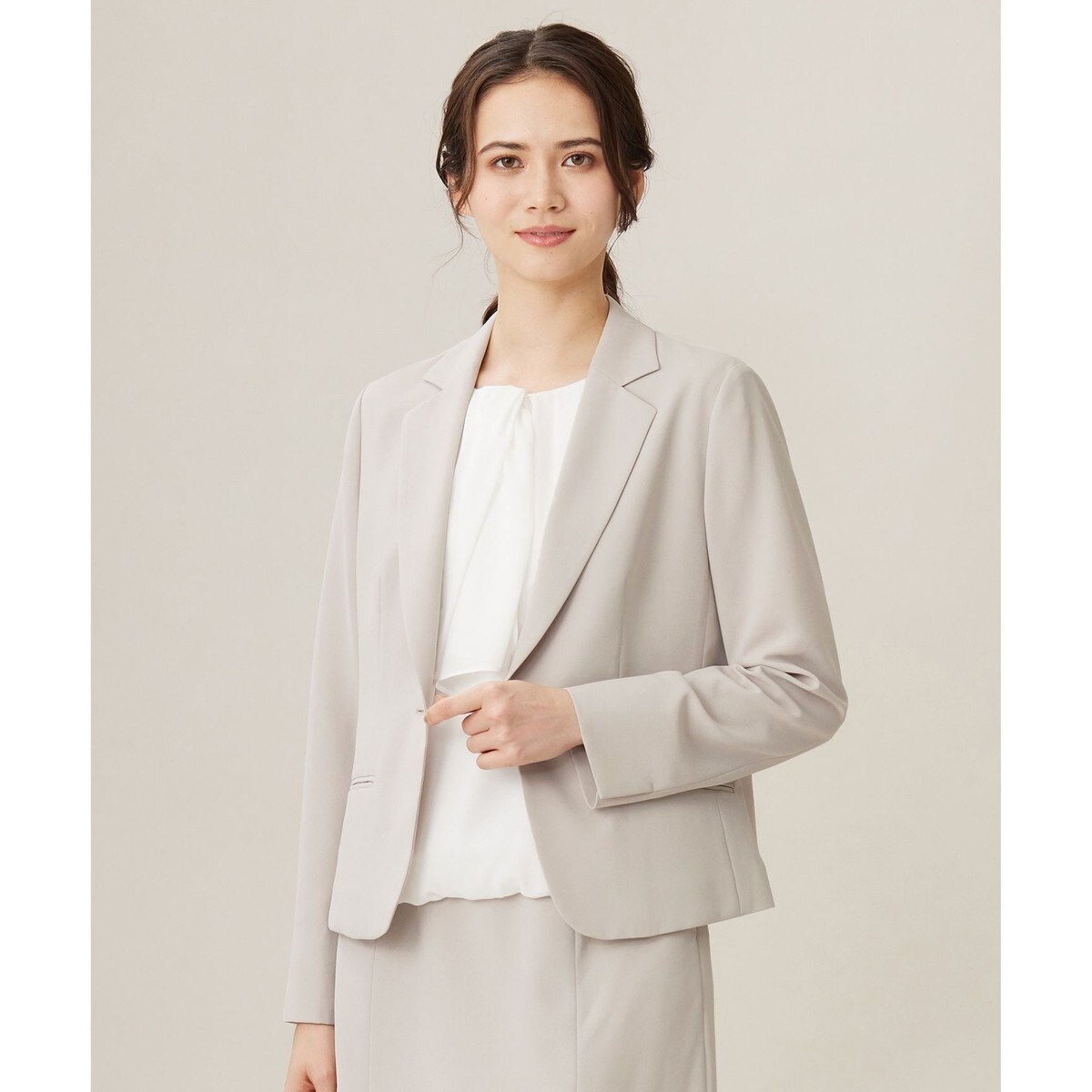 ■デザイン1枚持っていると便利な定番のテーラードジャケットです。ベーシックなデザインですが、コンパクトですっきりとした美しいシルエットがポイントです。ワンピースの上から羽織ったり、同素材のスカート(SKW7CM0403)と合わせたセットアップでの着こなしがおすすめです。※モデル画像はサンプルを使用しており、実際にお届けする商品はポケット位置、ボタン位置がやや上になります。正しい仕様は物画像(モデル着用ではない画像)をご参照ください。