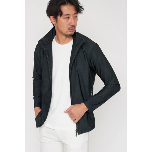 ムラ染調レザー柄プリントのハイテンション生地を使用したスタンドブルゾンです。