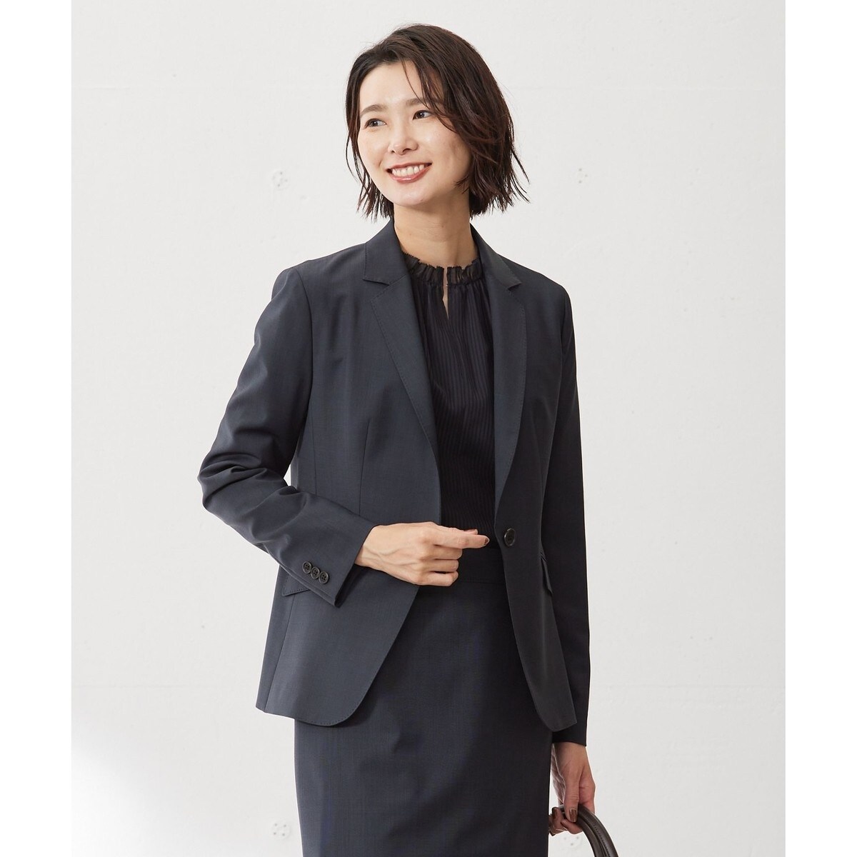 オーソドックスな1つボタンのテーラードジャケット。Air Trailoringと呼ばれる仕立てを施し、着心地の良さを追及しました。驚きの軽さを実現し、服の重みを感じさせにくくするために肩の部分に負担がかからないように前肩の設計で縫製。肩パットも入れないことで、より軽く動きやすいアイテムに仕上げました。スッキリと細身のシルエットで、着丈もスカートパンツとのバランス良く合わせられるようにしています。J.PRESSブランドロゴ入りのオリジナルボタンで、さりげなく特別感を演出。総裏ありです。