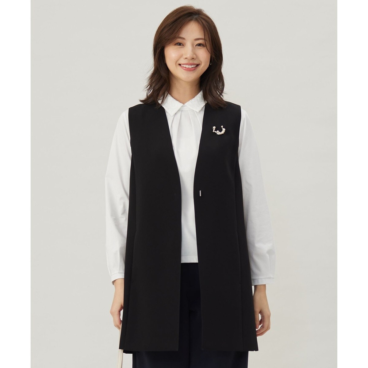 上品な雰囲気に仕上げた、トレンド感のあるジレ。すっきりとしたIラインシルエットが気になる腰まわりを隠してくれるため、ワードローブに1枚あると重宝します。シャープな印象のVネックで着回しやすく、気温に合わせてインナーのトップスを変えることでロングシーズン活躍。実用的なポケット付きで、両サイドにスリットを入れて動きやすく仕上げました。同シリーズのパンツと合わせたきちんと感のある着こなしはもちろん、単品使いもできるアイテムで、旬な通勤スタイルが完成します。背抜き仕様です。