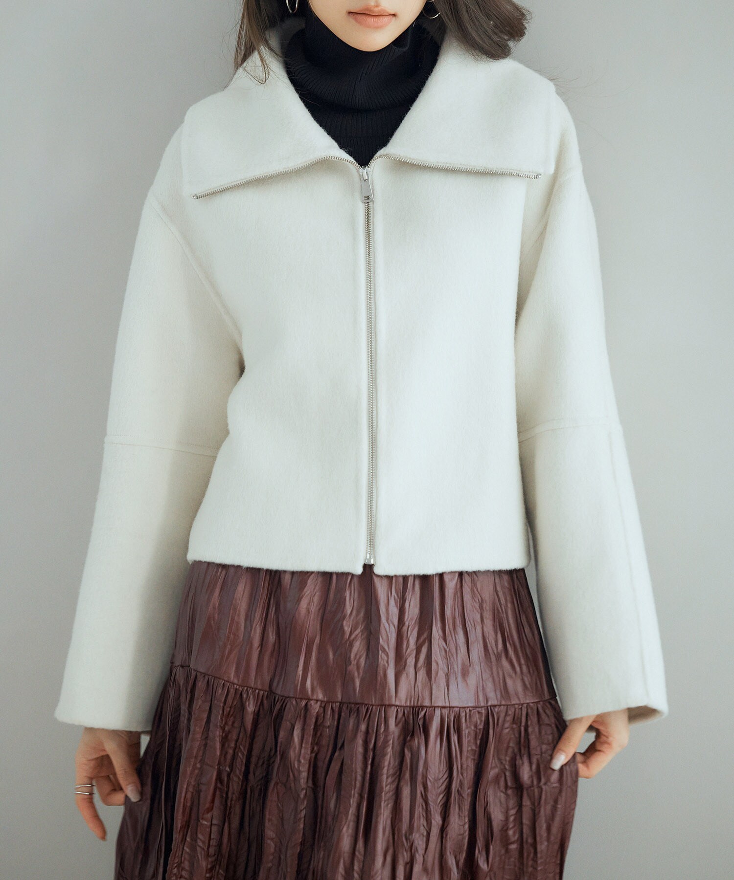 デザインポイントとなるケープのようなビッグ衿がこなれ感満点。一枚でおしゃれスタイルが完成します。