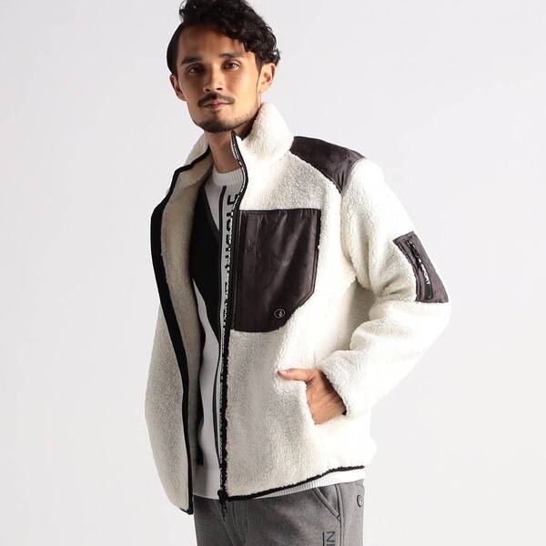 風を通さない総裏仕様のスタンドブルゾン。ファスナーはオリジナルロゴプリントファスナーを採用しています。ショルダーパッチとポケットパーツにはカモフラジャカードを施し、ワンランク上のボアブルゾンに仕上げました。ジョガーやテックパンツと合せてスポーティな雰囲気に。暖かさとスタイルを両立した一着です。