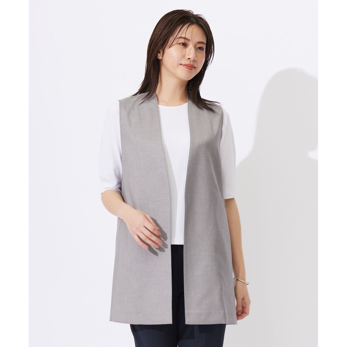 シャープな襟のラインとストレートなシルエットで、大人っぽさを演出するジレ。さらっと着流しスタイルでカットソー、ブラウス、ニット等を合わせるとトレンド感のあるコーディネートが完成します。合わせるアイテムによって、きれい目からカジュアルまでスタイリングの幅が広がります。ポケット付きのデザインで使い勝手も◎。腰まわりを隠してくれる丈感で、同素材のパンツともバランスよく着用いただけます。裏地なしです。カラーは、清潔感のあるライトグレー(#003)、女性らしい柔らかな印象のベージュ(#033)、ベーシックなネイビー(#075)、上品で華やかなシルバー(#091)の4色で展開します。