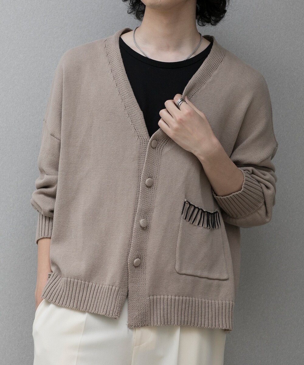 ・ポケットのリブ編みの部分に飾りステッチがかけられていて、シンプルではありつつも他とは違う個性のあるカーディガンです。