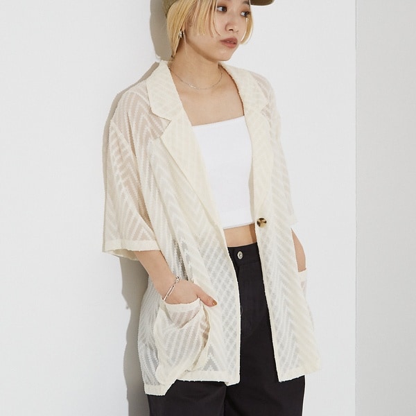 さらりとしたリネンライクな素材と今年らしい織柄入りのシアー素材、ジャージー素材の3素材展開のジャケット。