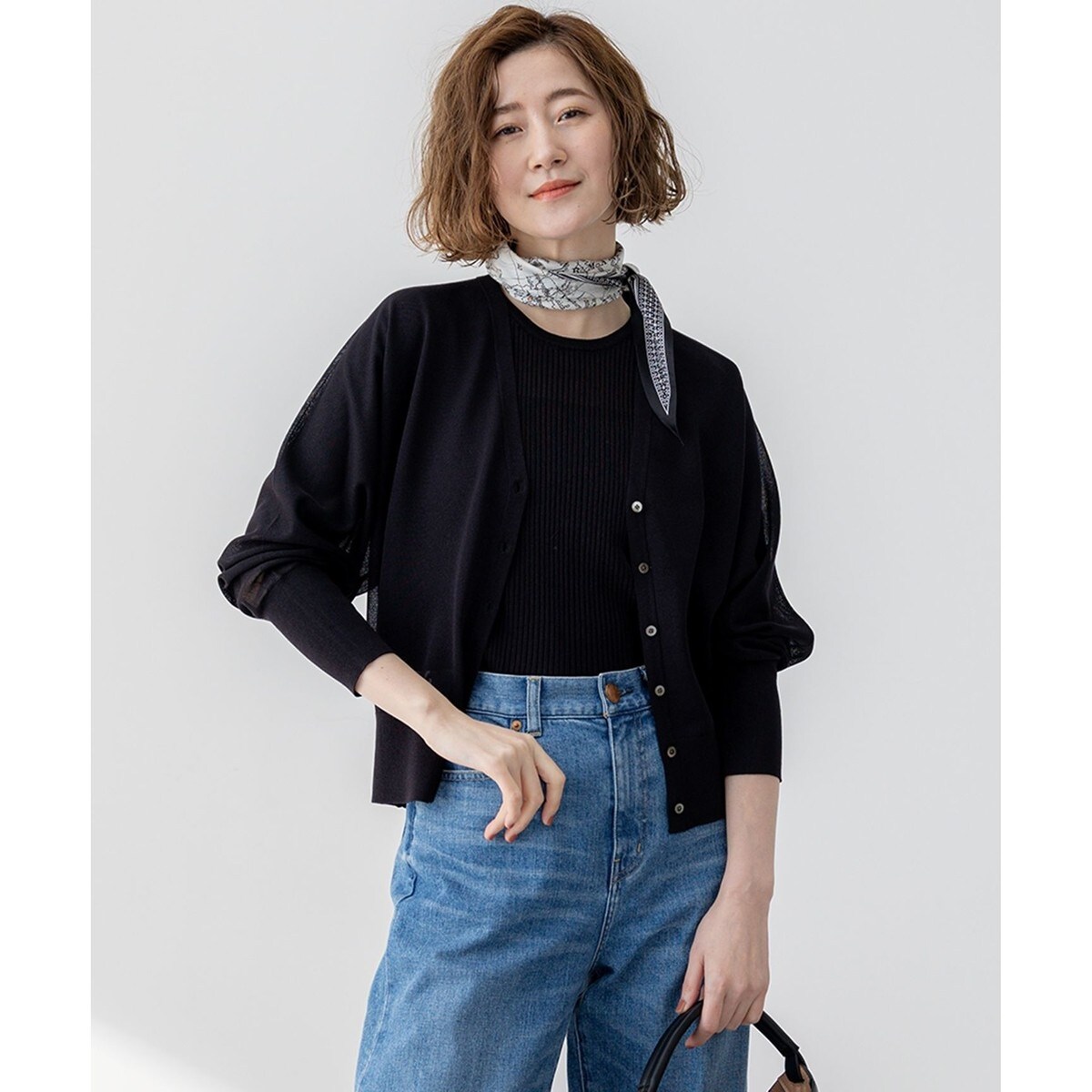 天竺編みのドルマンスリーブカーディガン。細めの前立てですっきりと仕上げました。長めの袖口リブにはスリット入りです。コンパクトな丈感なので、ボタンを閉めてプルオーバー風に着用していただくのもおすすめです。ほど良い透け感と微光沢な素材がエレガントで、一枚羽織るだけでさり気ない華やかさをコーディネートにプラスします。カラーは、抜け感のあるアイボリー(#003)、ベーシックなブラック(#005)、やわらかなベージュ(#033)、こなれ感のあるダークブラウン(#035)、爽やかなスカイブルー(#072)の5色展開です。
