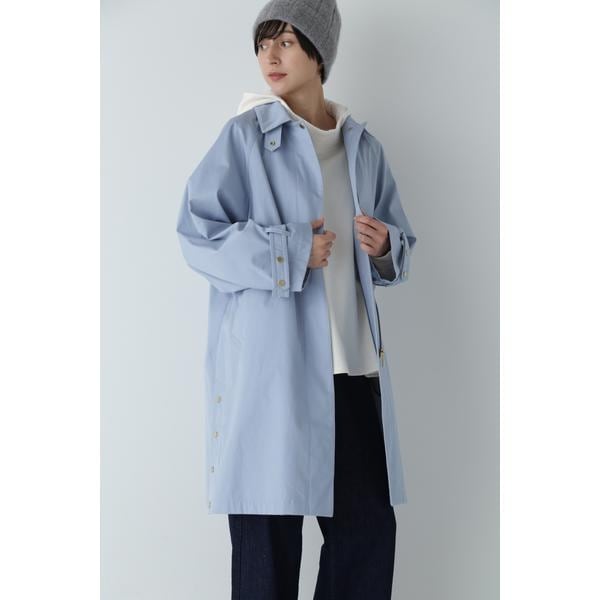 袖周りを広くとったラグランスリーブのステンカラーコート。脇のドットボタンを開けることでスリットのアレンジが可能です。裏衿のミニベルトは閉めることでスタンドカラーに変化します。