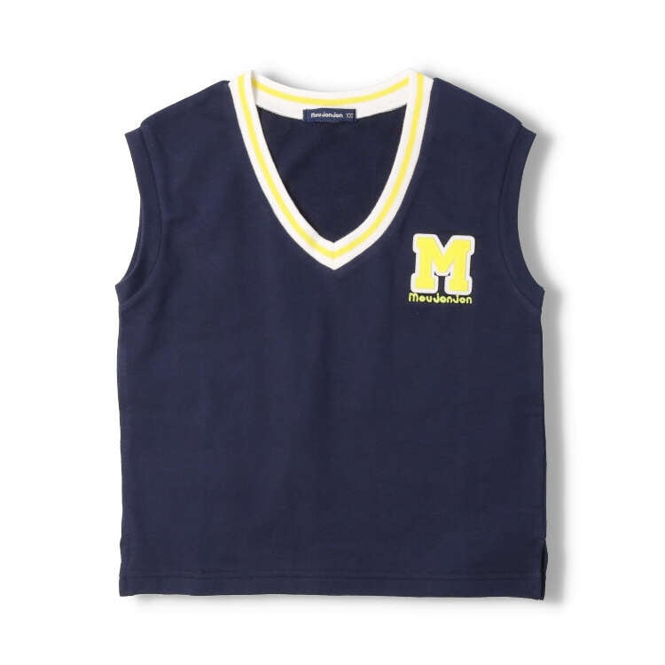 トレーナーよりは薄手、Tシャツよりは厚手のミニ裏毛素材のベスト。ライン入りのリブが衿ぐりに付いたプレッピーなイメージ。少しゆとりのあるシルエットで重ね着してもすっきりと見えます。胸のMの立体感のあるワッペンもポイント!【アイテム】トップス カジュアル お洒落 オシャレ かっこいい かわいい 可愛い 普段着 デイリーウェア お出かけ着 お外着 お外遊び着 子ども服 こども服 男児 男の子 ボーイズ キッズ ベビーサイズ トドラーサイズ 幼稚園 保育園 小学校 通園 通学 小学生 2024年春物新作 丸高衣料 グレー 灰色 コン ネイビー 紺色 ムージョンジョン コットン100% 綿100%