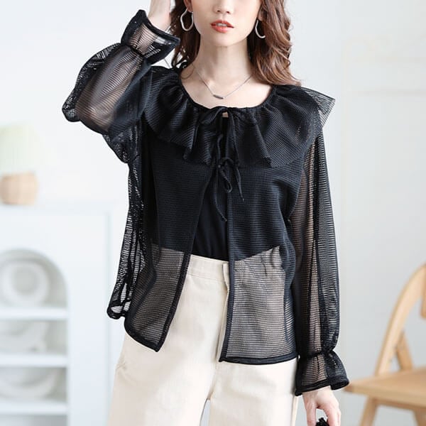 体型カバーも大人可愛いもぎゅーっと詰め込んだフレアカラーメッシュカーディガンの登場です♪ゆったりとしたサイジングと大人可愛いディティールでお洒落が加速すること間違いなしの一着!ヘルシーな雰囲気醸し出すメッシュ素材がコーデに抜け感をプラスし、気になるボディラインをぼかしてくれるのもオススメのポイントです◎腰に掛かるやや短め着丈で脚長効果のある重ね着しやすい着丈なのも嬉しいポイント!中に合わせるインナー次第でロングシーズン楽しんでいただけるお洒落さん必見アイテム☆