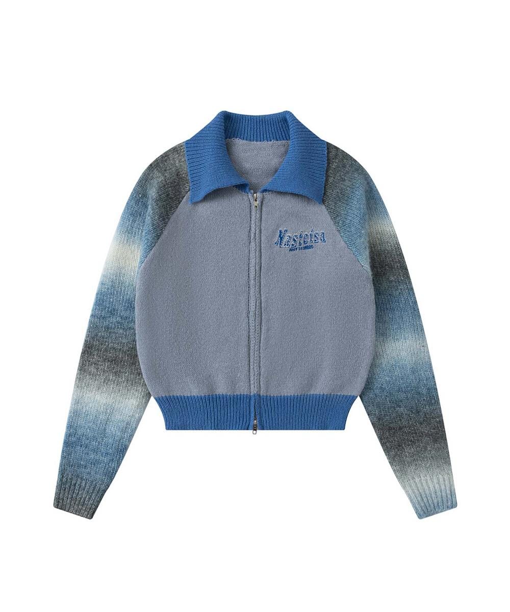 鮮やかなグラデーションとラグランスリーブが目を引く、ポロ襟のWジップカーディガン。