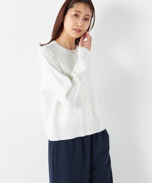 冬のレディな着こなしを約束するノーカラーニットカーデ