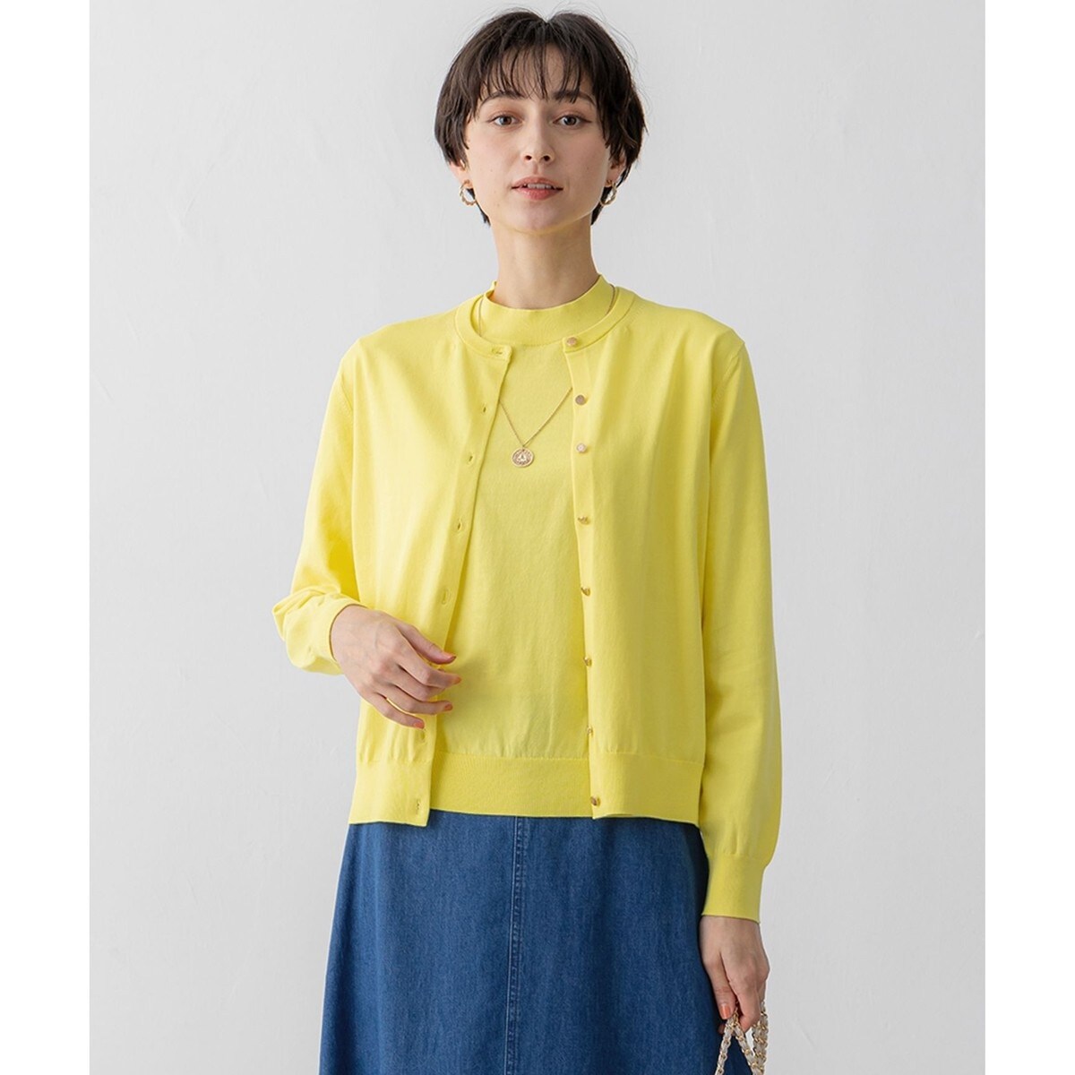 シンプルなオリジナルロゴメタルボタンが上品な印象のクルーネックカーディガン。コーディネートのアクセントに効かせたり、また同素材の半袖ニットと合わせてクラシカルなスタイルにといろいろなシーンにも活躍してくれます。カラーは、ベーシックなホワイト(#001)、ヘルシーな印象のイエロー(#040)、爽やかなブルー(#070)、洗練された雰囲気のネイビー(#075)の4色展開です。