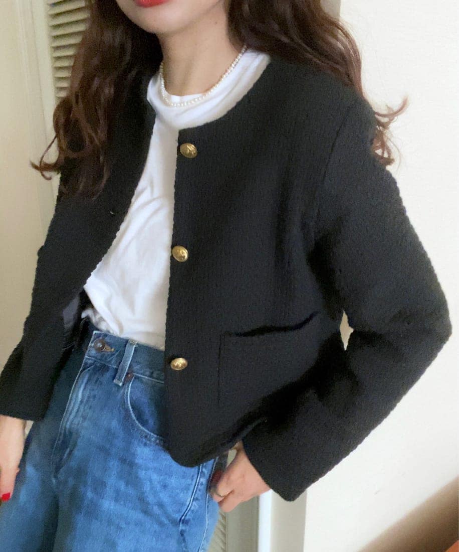 ノーカラーAライン金ボタンツイードジャケット/0/コットン/BLK/09WFJ221066