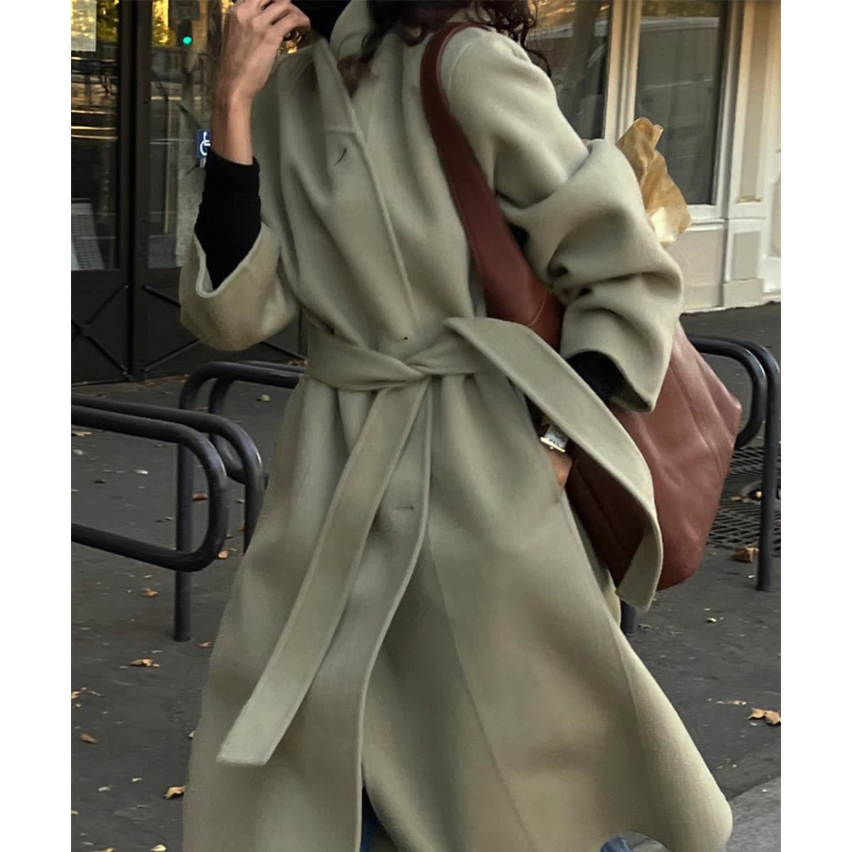 ブラウンベルト付きロングコート