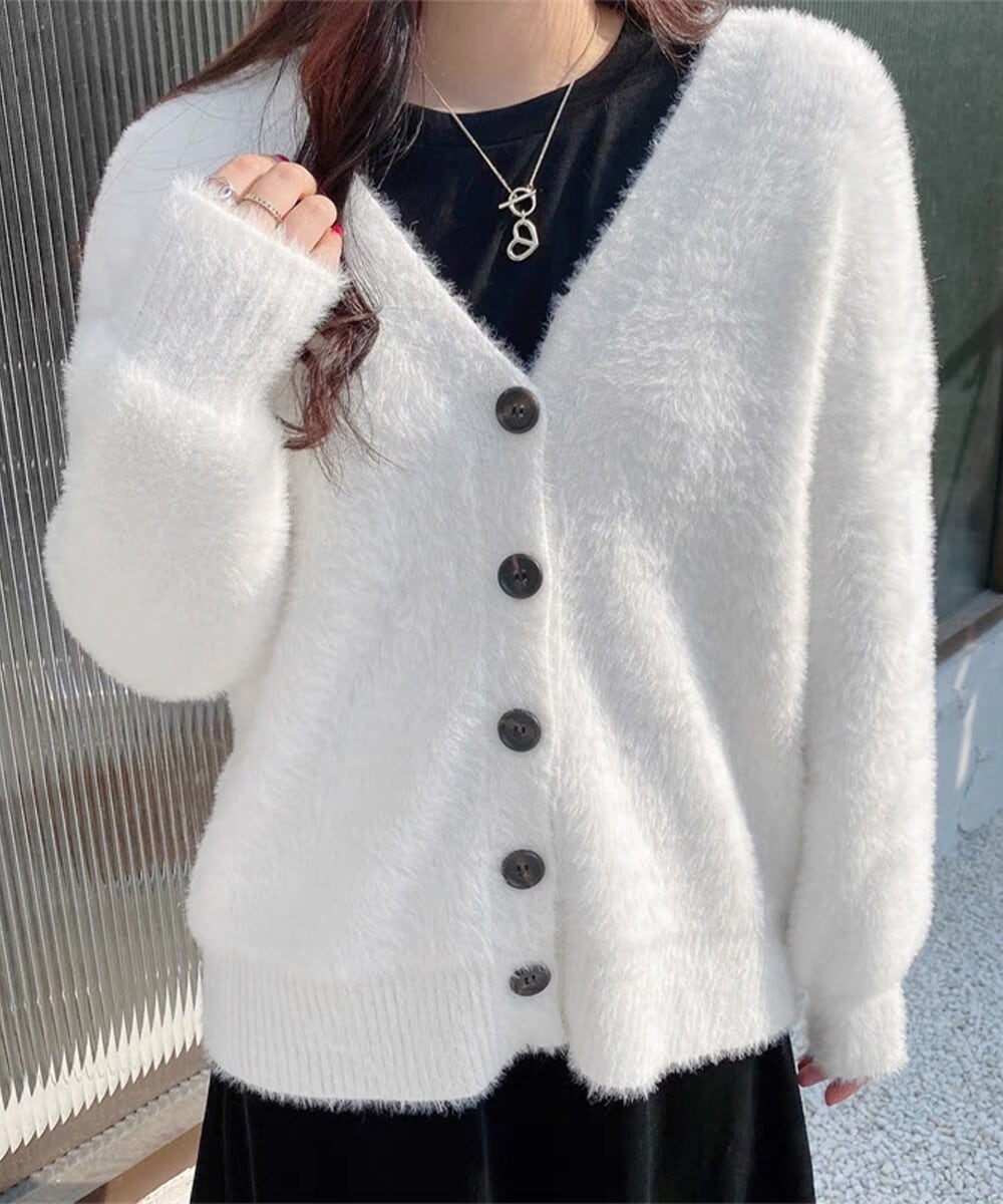 ルーズに羽織ってリラックス感のある着こなしを楽しめるシャギーニットカーディガン