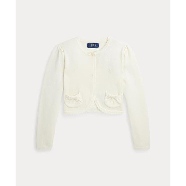 薄手のコームドコットン、スカラップトリム、ポケットにあしらったリボンでチャーミングな重ね着のルックを演出するカーディガン。・左胸にシグネチャーのポニー刺繍・スカラップトリムをあしらったクルーネック / フロント中央にボタン留め・長袖のパフドスリーブ / カフスにスカラップトリム・フロントウエストにパッチポケット2つ / ポケットにリボンのディテール・裾にスカラップトリム 【素材】・本体:綿 100% 装飾部分を除く【生産国】中国