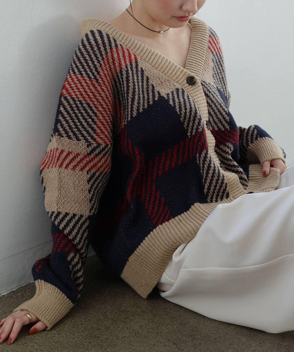 カーディガン(厚手)/L/アクリル/CML/チェック/復刻/モヘアライク