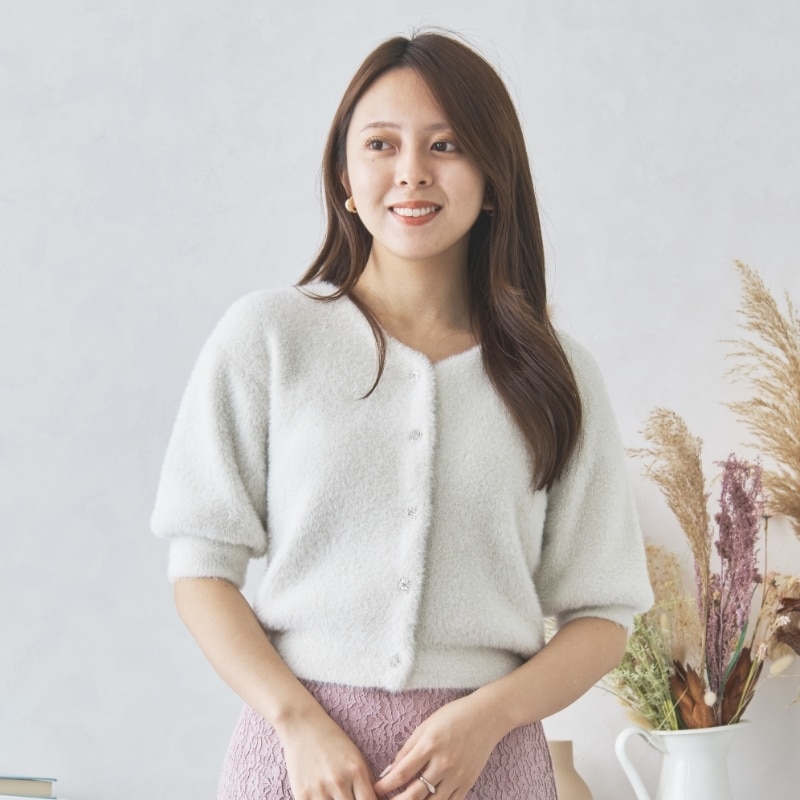 今季トレンドのシャギーは思わず触れたくなるような素材感で秋のマストアイテムです。デザインの異なるビジューボタンがミッシュらしく華やかで可愛らしいポイント。シルエットはデコルテを美しく見せるVネックのカーディガンタイプで、ボタンを留めてもスッキリとした抜け感があり、前後どちらでも着用できる2wayデザインです。トレンドの少し短めなショート丈はドロップしたふんわり6分のパフ袖が体型カバーも叶えてくれます。■fabric 透け感[無し] 裏地[無し] 伸縮性[有り] 生地の厚さ[やや厚手]