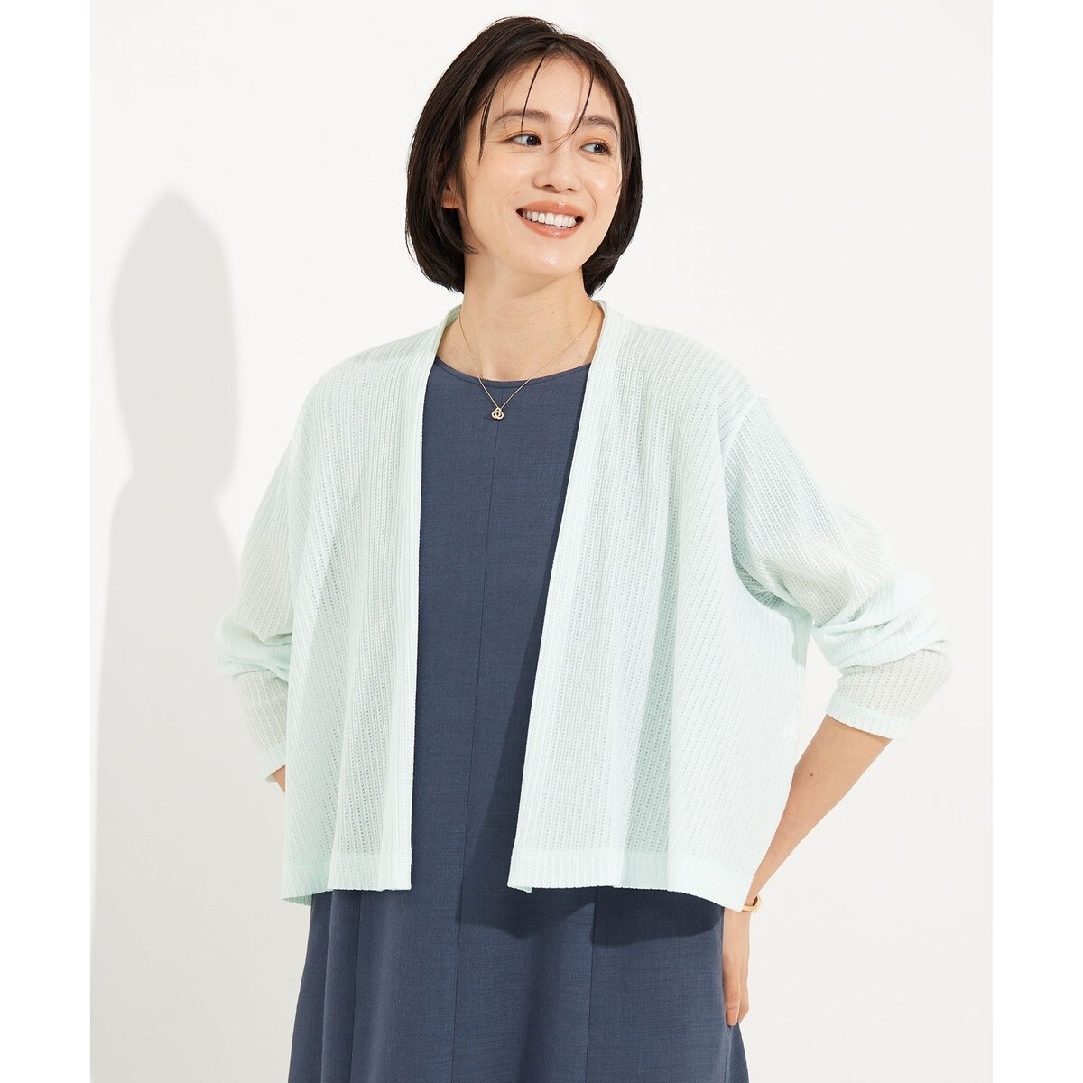 透かし柄が涼し気な、しなやかで軽いショート丈カーディガン■デザイン縦長の透かし柄が涼し気で、女性らしく柔らかい印象のカーディガンです。軽くさっと羽織れるので、外出時や旅先に持ち運びもしやすい便利な1枚です。今年らしいクロップド丈ですっきりとしたドルマンタイプなので、ワンピースやボリュームボトムと好相性です。インナーにプルオーバー(KKWMCM0538)を合わせることでアンサンブルとしても着て頂け、さりげない同素材、同柄の合わせがおしゃれ感をアップしてくれます。■素材保湿性と放湿性のバランスのとれた上品な光沢の綿糸とポリエステルを使用しております。肌離れが良くなるように工夫した編地で、さらに涼し気な透かし柄を編み立てています。■同素材アイテムロング丈カーディガン(KKWMCM0537)プルオーバー(KKWMCM0538)