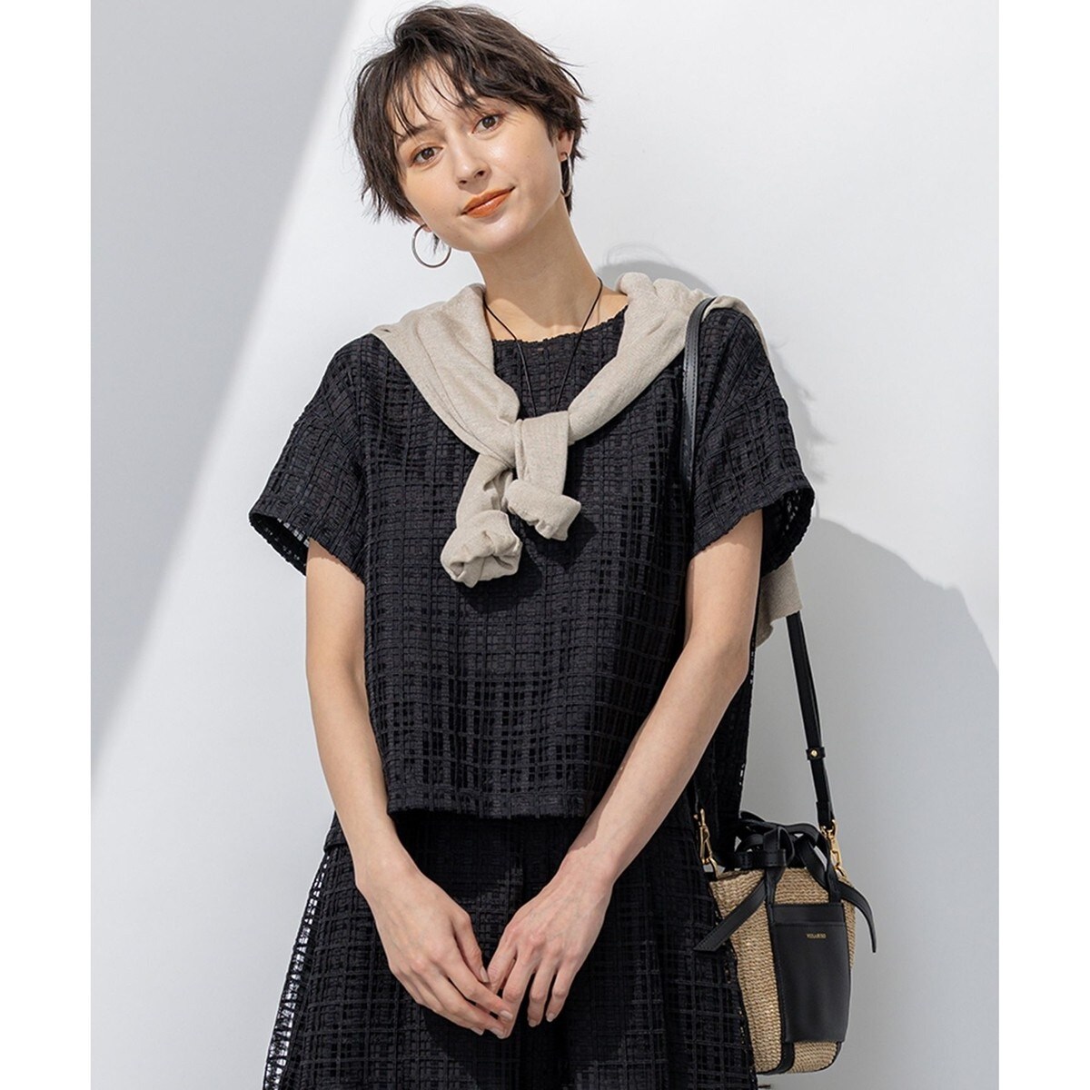 チェック柄のレース地がポイントのブラウスです。シンプルなデザインなのでボトムを選ばず、様々なコーディネートをお楽しみいただけます。同素材のスカートを合わせたセットアップスタイルもおすすめです。センターバックに施した金属ファスナーとグログランテープがアクセントになっています。カラーは印象がシックに決まるブラック(#005)と、抜け感のあるダークブラウン(#035)の2色展開です。