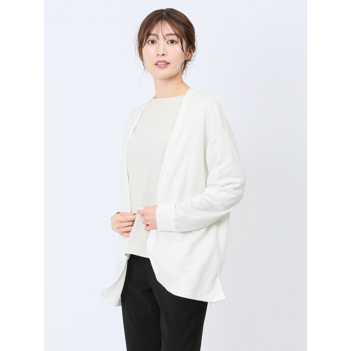 サラッと羽織れる着流しタイプのトッパーカーディガンです。すっきりとしたリブ編みと裾のスリットがポイントになっています。外出時の日焼け防止や屋内の冷房対策に便利な一枚です。
