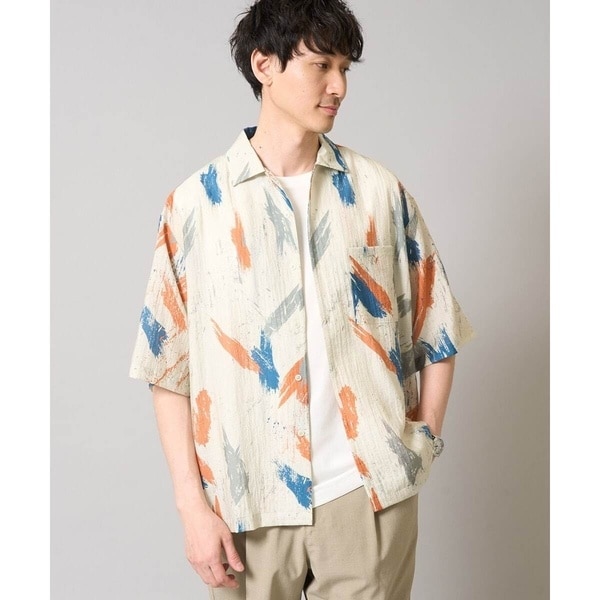 ◆透け感・凹凸感のあるドビー素材にアーティスティックなペイント柄のプリントを施したオープンカラ―シャツ◆