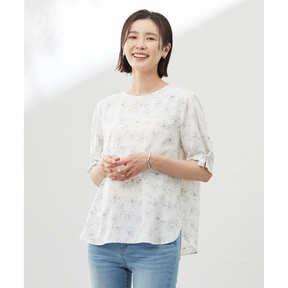■デザインボートネックのプルオーバーブラウス。袖丈も長めの半袖で、袖口にタックディティールを施し、1枚着でもサマになるデザインです。シルエットもゆったりとしており、着心地が良く、きれい目にもカジュアルにも着ていただける1枚です。さりげなく身体のラインをカバーしてくれる着丈が嬉しいポイント。ラフタッチの花柄で、シンプルなスカートやパンツとの相性が良いブラウスです。