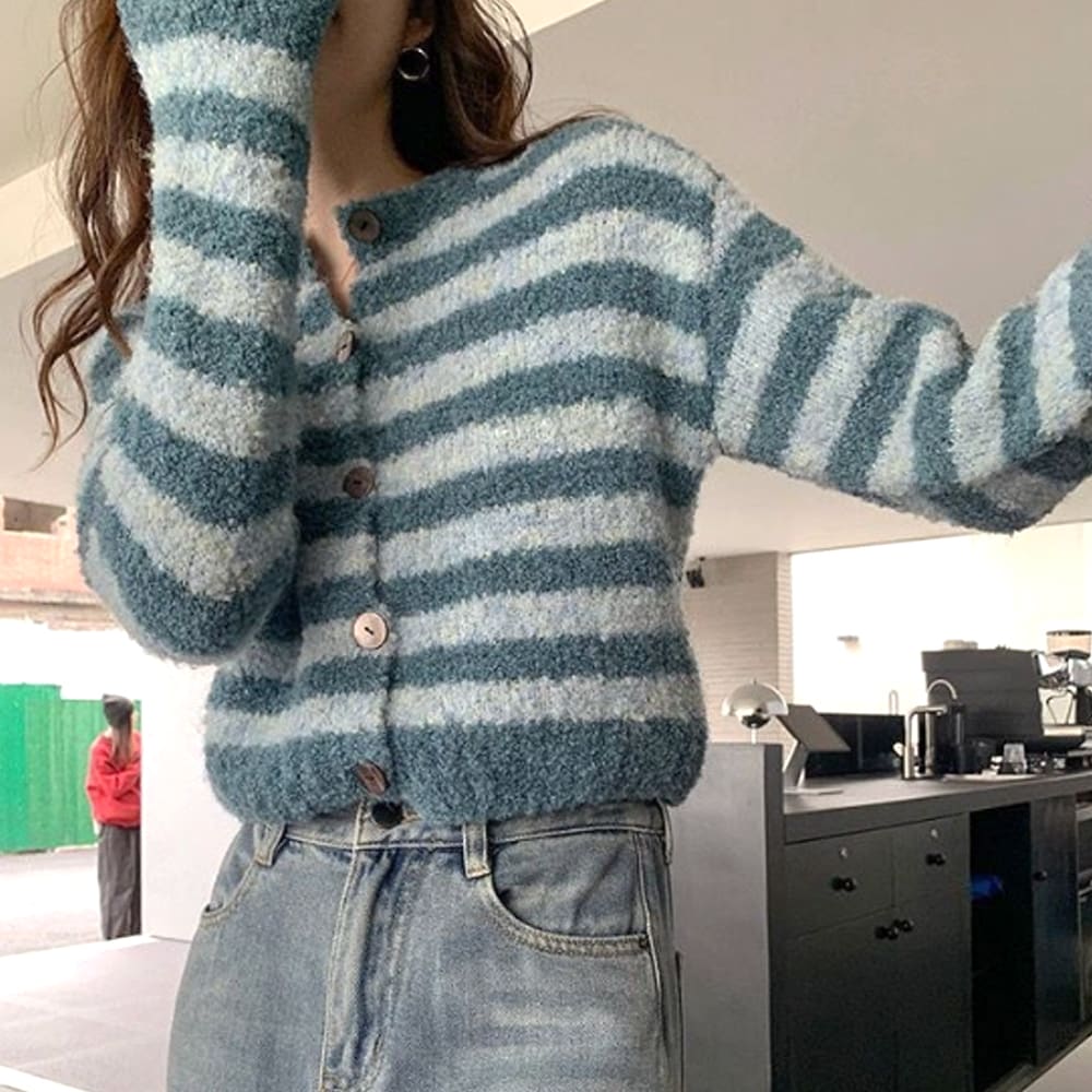 ビンテージ 韓国製 シャギーニットカーディガン 短丈 青 レトロ オシャレ 羽織り ニュアンスカラー クロップド ふわふわ もこもこ