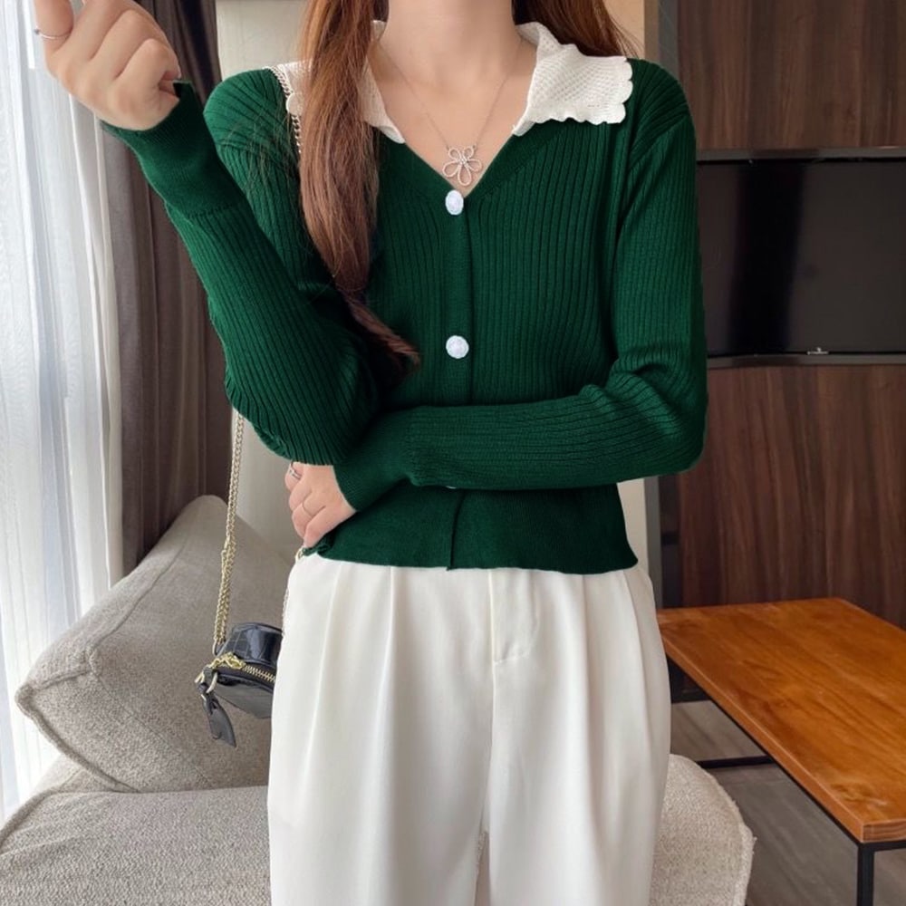 フロントボタン付きと配色の襟がレトロな印象のニットカーディガン