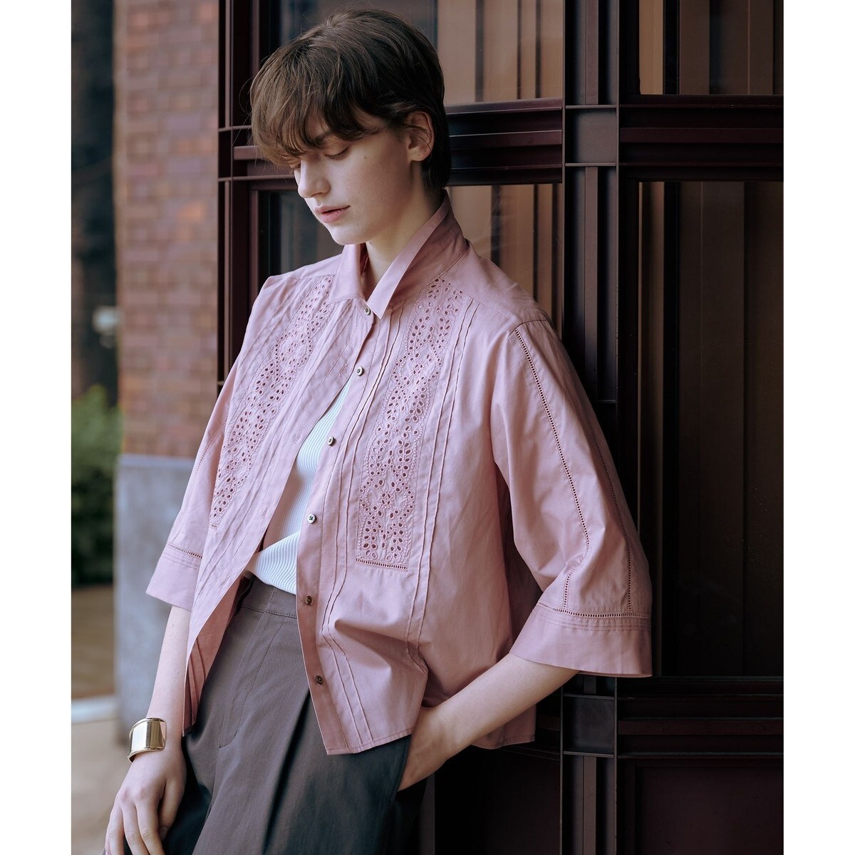■デザイントレンド感のあるグロップド丈の刺?ブラウス。フロント部分と袖に刺?をほどこし、またピンタックも入れた華やかさのあるデザインにしました。釦を閉じて一枚着とも、羽織りとしても着ていただけるので春夏のコディネートに活躍します。特にワイドパンツとのコーディネートが今年らしく着こなしが決まります。
