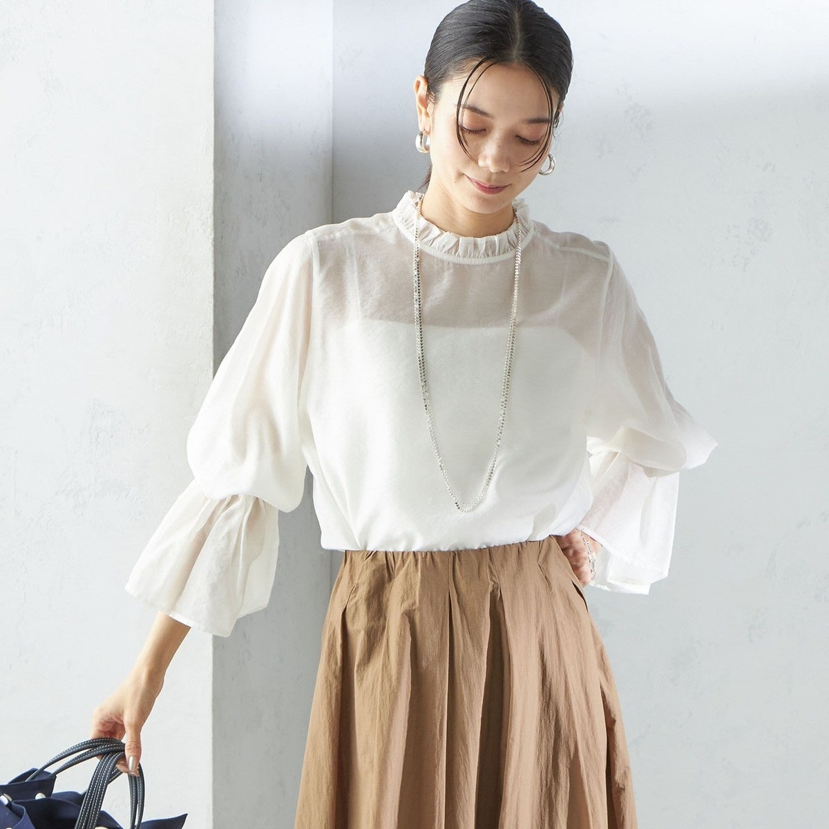 〈手洗い可能〉シルク混 シアー フリル ネック ギャザー ブラウス