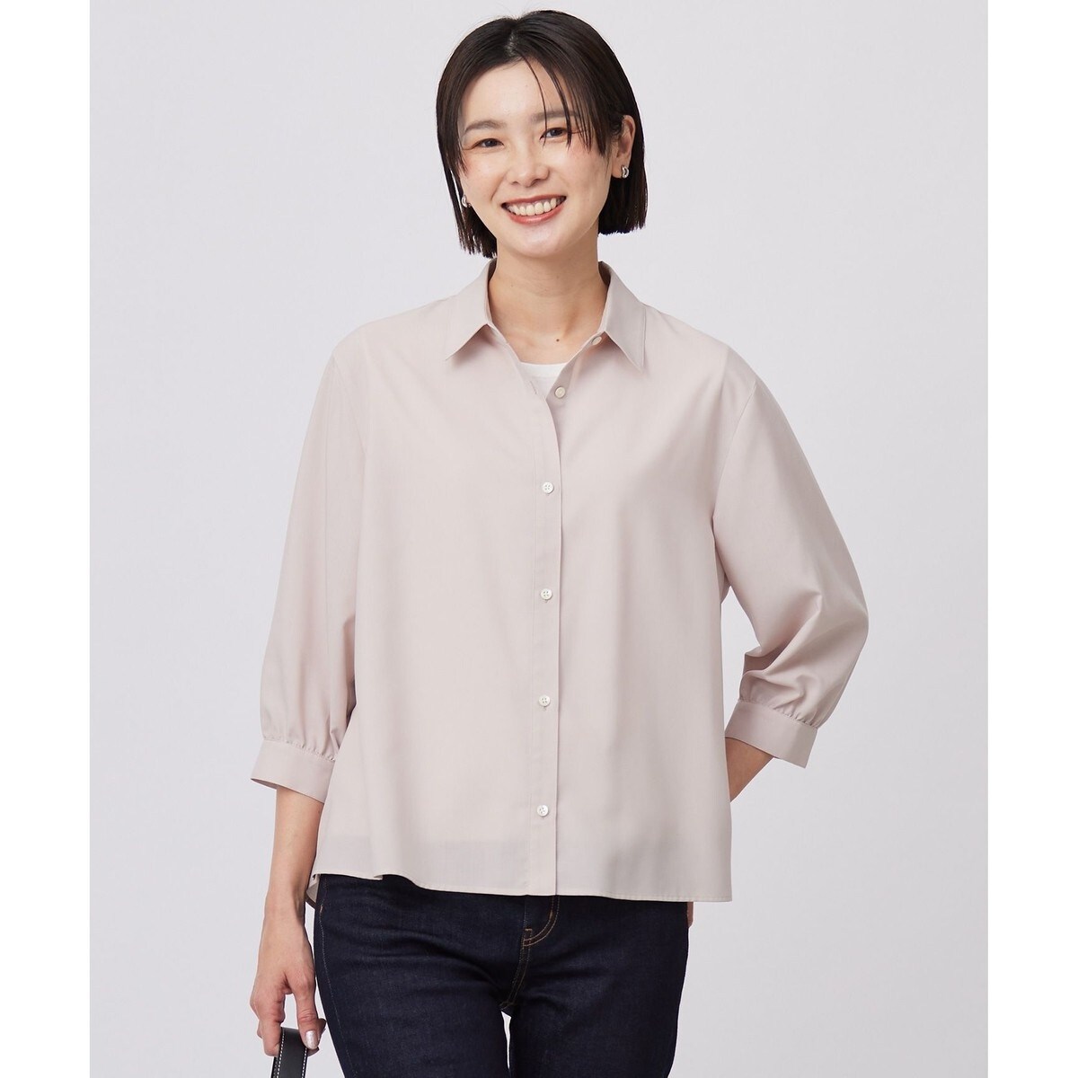 ■デザイントレンド感のあるシンプルなフロントデザインに対し、後ろはプリーツ加工を施されたさりげない華やかさをプラスしたブラウス。歩くたびにゆれるプリーツがエレガントな1着です。袖丈は7分袖、軽やかな生地感なのでオンオフ問わずに活躍してくれます。細身のパンツと相性が良く、春夏シーズンに爽やかな印象を与えてくれるブラウスです。
