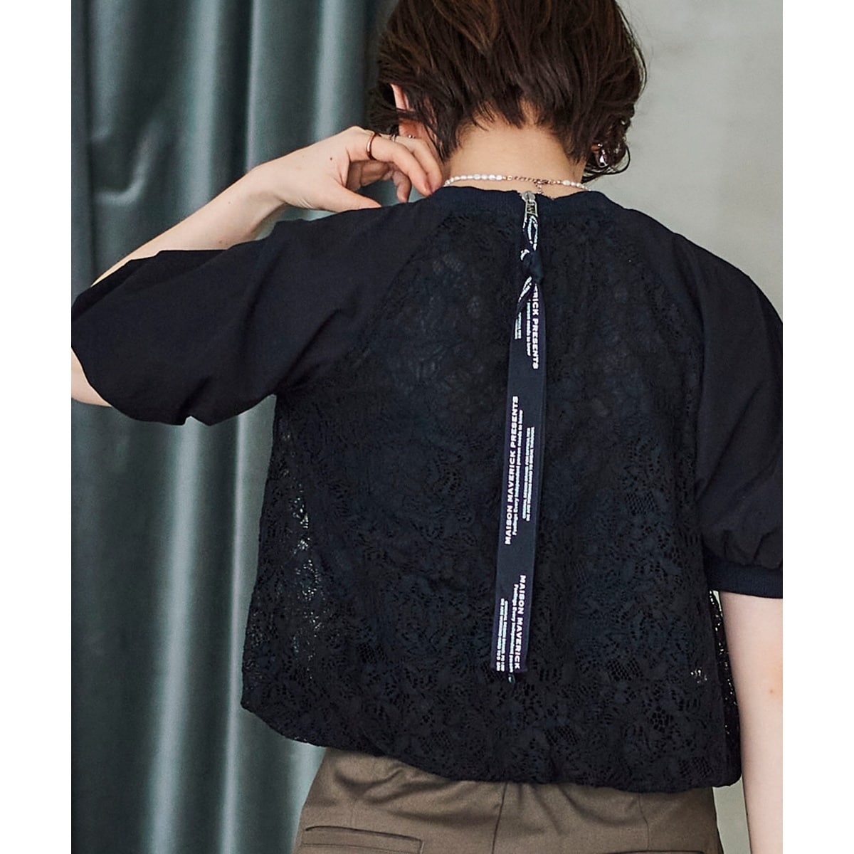 エレガントな花柄レースと異素材の組み合わせが特徴のレースバルーンスリーブブラウス。