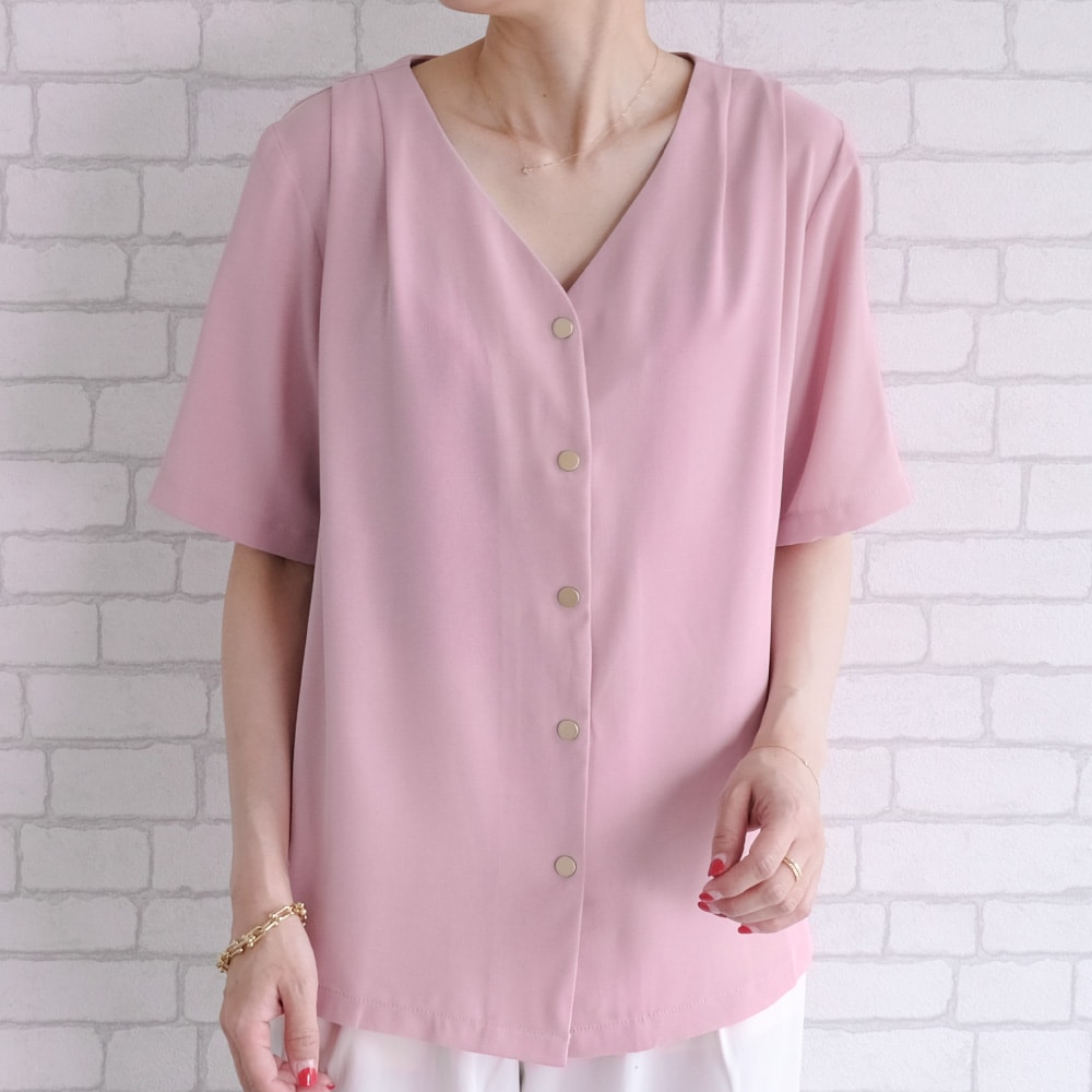 シンプルなデザインで着回ししやすいショルダータックVネックブラウス程よく落ち感のある、さらっとした生地で速乾性もあるのでデイリーウェアとして最適♪Vネックデザインが顔まわりをスッキリ見せ女性らしさを引き立てます。