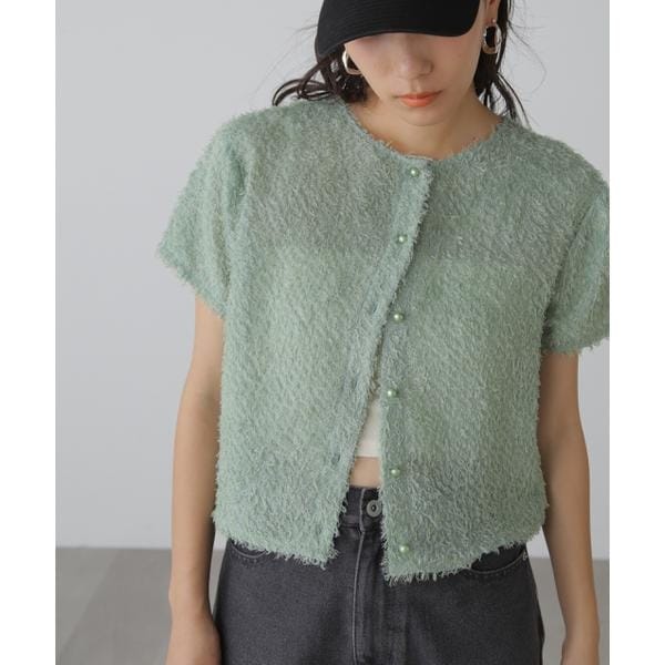 (fabric&design)ふわっと毛足の長いジャガード素材で仕上げた、トレンド感バツグンな映えブラウス。見た目はふわっとしていますが、シアー素材のブラウスなので夏も涼しげに着用いただけます。(styling)デニムパンツやカーゴなどのカジュアルなボトムスにも合わせられるように、Tシャツ型のシンプルな形で仕上げました。前開きで羽織っても、前を閉めてトップスとしても着られる万能なアイテムです。